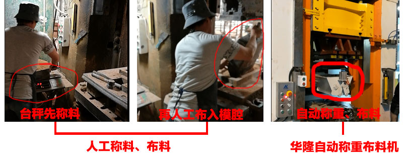也有部分耐材企業在這個環節選擇了新技術的應用,華隆自動稱重布料機。可以實現自動上料、計量稱重、布料到模腔內。可以減少一個人工的使用,同時避免了人為因素對產品質量的影響,保證產品質量的一致性。